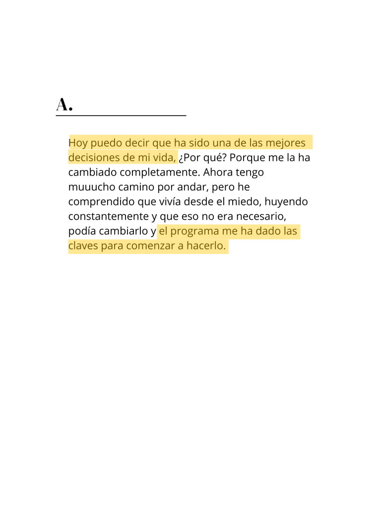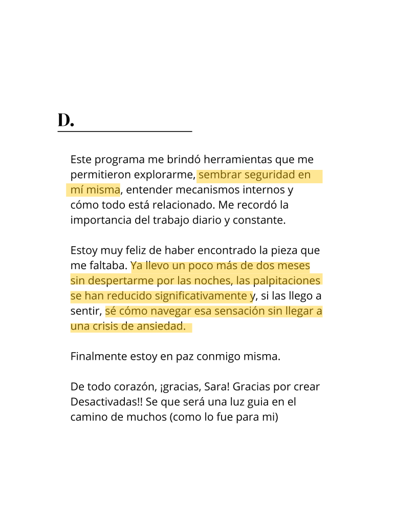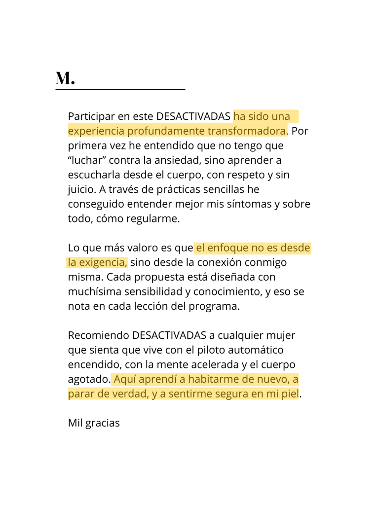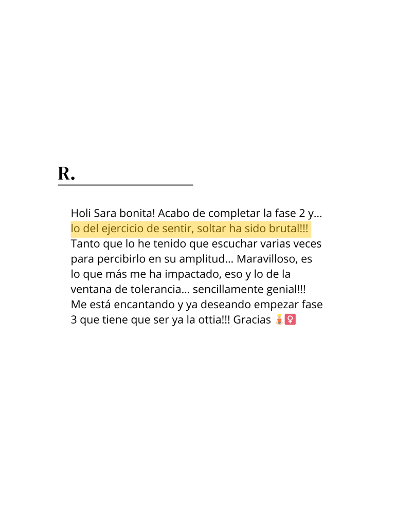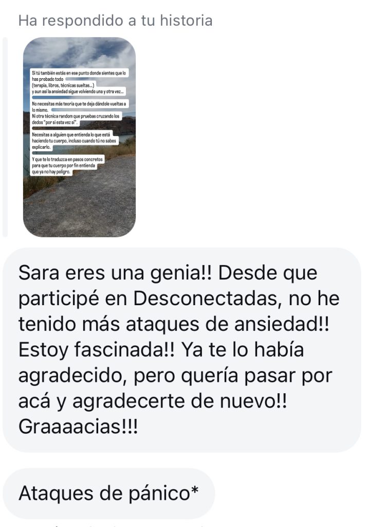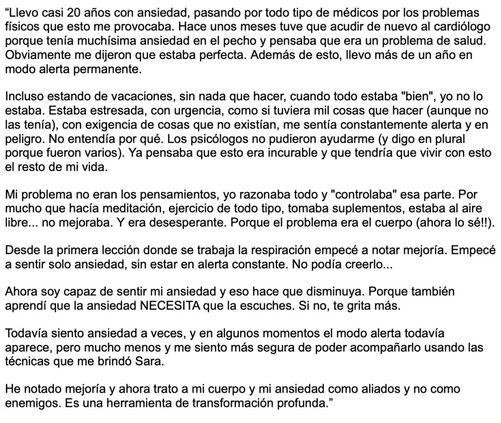 Yess! Muchas personas en terapia se sienten frustradas porque entienden su ansiedad, pero siguen viviendo con el nudo en el estómago, las taquicardias o el pecho encogido de forma constante. Este programa es el complemento ideal si ya estás en un proceso porque trabaja justo lo que la mayoría de terapias no abordan en profundidad: el cuerpo. Y, además, creado por una psicóloga: yo.